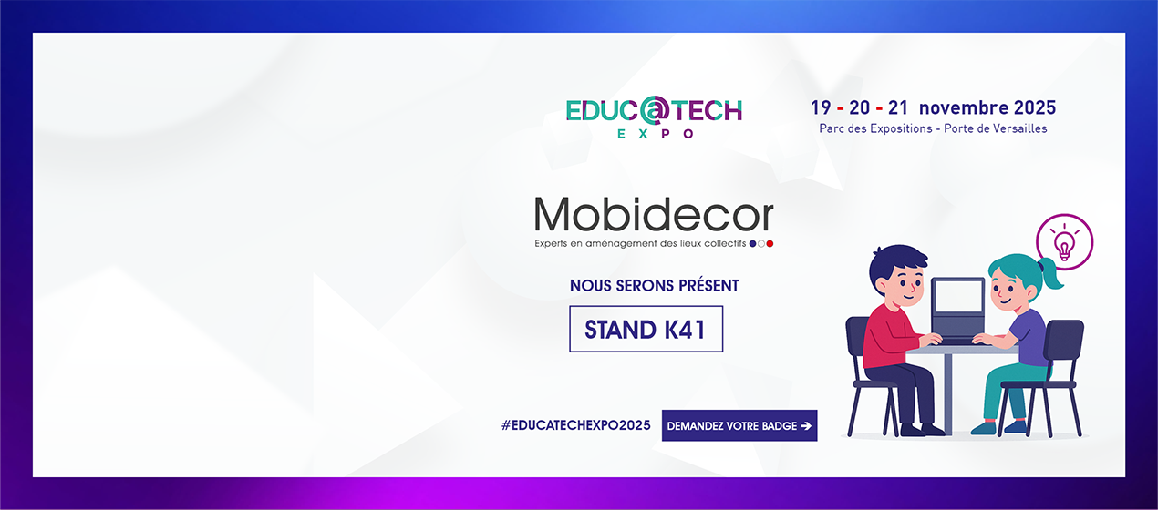 MOBIDECOR regroupe un savoir-faire unique de plus de 400 collaborateurs répartis dans nos 4 usines françaises. Nous sommes leader de l’aménagement de tous les lieux collectifs : éducation de l’école à l’enseignement supérieur, hébergement et restauration, bibliothèques de la médiathèque au CDI, amphithéâtre ou salle informatique, ou encore salles de réunion et espaces d’accueil.